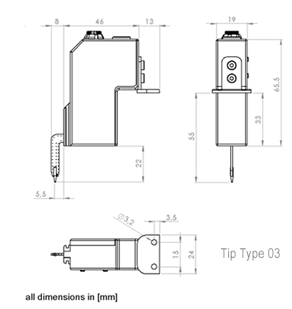 The product range of Langer EMV-Technik GmbH is completed by different tip types, i.e. the dimensions of the probe tip in relation to the housing. While the standard tip type 01 is close to the housing, tip type 02 offers more space both laterally and downwards. Tip type 03 is designed for users who require extra space at the bottom. Other customized tip types are available upon request. All tip types can also be ordered for the ICI series.