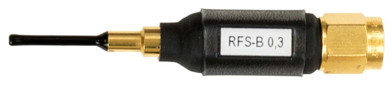 The RFS-B 0.3-3 is a passive magnetic field scanner probe. The probe head is basically constructed as for the RF-B 3-2. Field lines from other sources entering the probe head laterally are not detected. Because of its very small design, it can be used for measurements at hard to reach spots ,e.g. between components. It has a current attenuating sheath and its upper side is electrically shielded. It can be connected to a spectrum analyzer or an oscilloscope with a 50 Ω input. The H-field probe does not have an internal terminating resistance of 50 Ω.