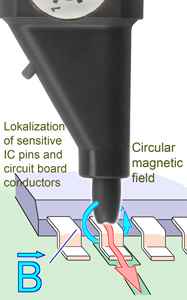 An assembly (device under test) often has a majority of less-sensitive and insensitive signal connections (conducting paths, IC pins). The sensitive signal connections can be easily detected by the mini burst generator and protected through appropriate layout changes. Conventional generators and test stations can be used to determine whether a device complies with the standard noise immunity required by law. However, weak spots on an assemby can not be presicely located. Detailed information about their location, susceptibility and type of action (E-field or B field susceptibility) are required to easily and efficiently locate them on the printed circuit board and eliminate them. Mini burst field generators are handy and can be used at the developer’s own workspace.