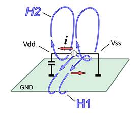 Im Bild 3 ist eine Vdd/ Vss IC-Stromschleife dargestellt. Die stärksten Magnetfelder entstehen durch den Versorgungsstrom i des ICs. Der Stromfluss i führt vom Vdd Pin über den Stützkondensator durch die Kupferlage der Flachbaugruppe zum Vss-Pin in den IC zurück. Der Strom i erzeugt das Magnetfeld H1 und H2. Das Feld H2 bildet sich um den Stromleiter des ICs und das Feld H1 um die Kupferlage der Flachbaugruppe aus (Bild 3).