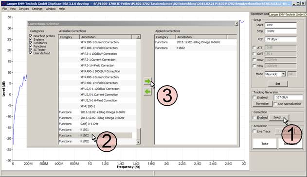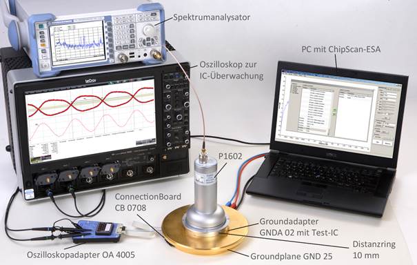 Der Test-IC wird mit der Steuerungs- und Versorgungseinrichtung in den entsprechenden Betriebszustand geschaltet. Versorgungsspannung und Versorgungsstrom wird überwacht. Im Spektrumanalysator werden die entsprechenden Messparameter (Start, Stopp, Span, BW, …) eingestellt. Die Messanordnung ist nach 3.4 (2.3.1, 3.3.1, 3.3.2) aufgebaut. Die Messung kann mit der Software ChipScan-ESA oder unter Zuhilfenahme kundenspezifischer Anwendungen erfolgen. Mit der Software ChipScan-ESA lassen sich der Messablauf dokumentieren, Korrekturkurven anwenden und Umrechnungen ausführen.