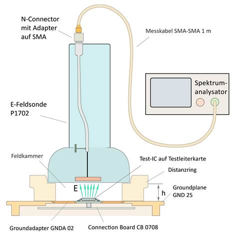 Der Test-IC befindet sich auf der Testleiterkarte. Die Feldsonde wird mit Hilfe eines Distanzrings im definierten Abstand h = 10 mm oder 3 mm über dem Test-IC angeordnet. Das Messsignal wird über ein Messkabel dem Spektrumanalysator zugeführt. Das Messsignal wird mit Hilfe eines Korrekturfaktors in elektrischen Erregerstrom oder in magnetischen Fluss umgerechnet.