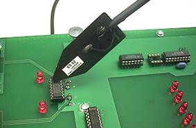 | ES 02 couples an electric field to the housing of an IC. The tip of the E-field source is placed onto the IC housing to examine individual areas. This method can also be used for other components (SMD resistors) or conductor runs. |